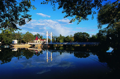 位于扎兰屯市北部,得名于园内的吊桥。吊桥始建于清德宗光绪三十一年(公元1905年),占地面积68公顷。造型奇特,公园内古树参天,绿柳倒垂,亭台错落,河水碧波荡漾,颇似江南水乡。进入公园大门,作家老舍先生1961年游览扎兰屯时所作《辛丑夏访扎兰屯》诗句的碑刻便映入眼帘: