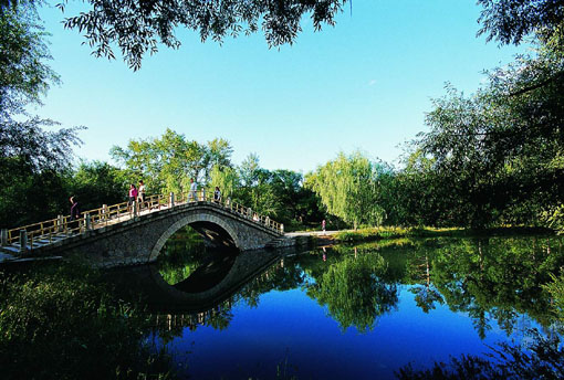 再往里走,清澈的小河上,吊桥横卧,两根巨大的铁索高悬于空中,锁链从四尊高大的汉白玉柱顶端的孔口穿过,牢系在深插于地下的铁环上。铁索自高而下,中部呈一弧形,上面系有42根铁索,将一座乳白色雕花栏杆木板桥悬吊于碧波之上。吊桥长