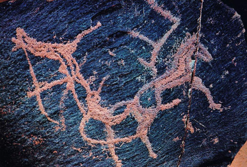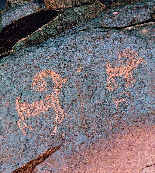 桌子山岩画群是乌海市珍贵的人文景观,集中分布在召烧沟、苦菜沟、毛尔沟、苏白音沟、苏白音后沟、雀儿沟等距市区10公里至15公里的崇山峻岭中,距今已有六、七千年的历史。古时候,羌、乌桓、鲜卑、突厥、党项、蒙古等北方游牧民族,曾先后在这一带生存,并于崖壁沟畔遗存了他们古朴生动的文化艺术—岩画。内容主要反映当时先民们对生殖、神灵、天体、动物的崇拜和原始宗教意识,以及社会文化形态。风格独特,魅力无穷,画面笔法古朴,形象夸张,人面像多为四目双眉者。召烧沟岩画群中,有一幅一米见方的画面,描绘的是个四口之家。其中男性图像高大雄赳,十分突出,女性则矮小而苗条,中间是两个孩子。这幅画显示了这是个以男性为主的家庭。 是我国与世界岩画中的瑰宝之一,对探索与研究人类文明进程具有十分重要的价值,已引起中外学术界和有识之士的关注。