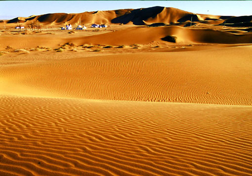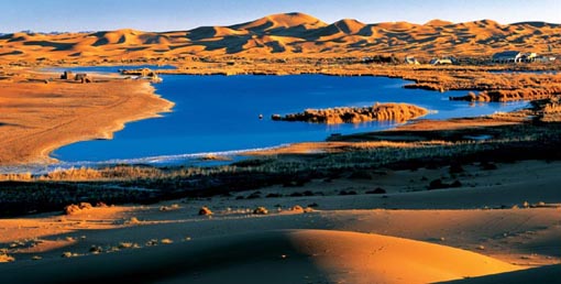 - 腾格里为蒙古语,意为“天”。沙漠以此为名,是说它像天一样浩渺无际。腾格里沙漠位于阿拉善左旗西南部和甘肃省中部边缘。东抵贺兰山,南越长城,西至雅布赖山。面积为3.67万平方公里,海拔1 200~1 400米。主要特点是沙丘、湖盆、山地、沙峰及平地相互交错。其中沙丘占70%以上,多为新月形沙丘链,高10~30米,常向东南移动,有大小湖盆400多个,多为淡水湖,可供人畜饮用,周围植物生长茂盛,为主要牧场,适合于开发沙漠探险、观光等旅游活动项目。