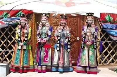 礼仪性对襟长坎肩以颜色艳丽的缎子为面料搭配而成,无袖无领,圆领座。领座、袖窿、4片下摆、左右开衩和后侧开衩的边缘镶有3种不同颜色的库锦镶边和由镂金彩线、金银曲线、直线组成的四指宽的沿边儿。在左、右和后侧开衩的上角还绣有平底云形图案。前面地对襟边缘绣有各式各样的“孛勒阿鲁哈”图案。