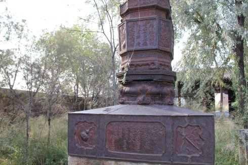 旗杆下端斗方与旗杆夹石的铁帽上铸有琴棋书画、梅兰竹菊、八骏马、暗八仙等图案。此外,还分别铸有记事铭文。左面铸:“经理:德懋张励行,双和店贾子莹,庆合店薛清,普益恒吴助周,山西太原府太谷县,金火炉朝阳聚盛隆造。金火匠人路安府襄邑南漳村,王聚文、付美、付信,吉日成造。”右面铸:“心富率徒弟圆昭,徒侄圆明,徒孙广灵。清同治元年,岁次壬戌律应仲吕谷旦,合镇叩敬。”