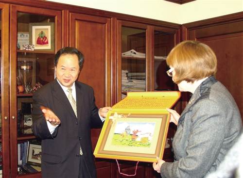 自治区旅游局副巡视员郑家宁(左)将内蒙古民族工艺品皮画赠与新西伯利亚州州政府副主席玛恰诺娃女士。