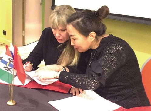 满洲里市口岸国际旅行社副总金萍(右)与俄企业签约。