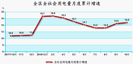 1—10月,全区全社会用电量2743.3亿千瓦时,同比增长14.8%,增速比上年同期加快4.1个百分点。其中,工业用电量2377.0亿千瓦时,增长14.1%,增速比上年同期加快3.7个百分点。货运量完成20.7亿吨,同比增长8.8%。其中,公路货运量13.4亿吨,增长8.6%;铁路货运量7.3亿吨,增长9.3%。