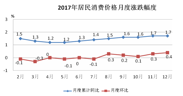 全年居民消费价格总水平比上年上涨1.7%。分城乡看,城市上涨1.7%,农村牧区上涨1.6%。分八大类消费类别看,呈现“七升一降”。衣着上涨1.3%,生活用品及服务上涨0.7%,教育文化和娱乐上涨1.0%,医疗保健上涨10.0%,居住价格上涨1.7%,交通和通信上涨1.4%,其他用品和服务上涨1.2%;食品烟酒价格下降0.2%。从工业生产者角度看,工业生产者购进价格和出厂价格分别上涨6.3%和10.6%。固定资产投资价格上涨3.4%,农产品生产价格下降4.4%。