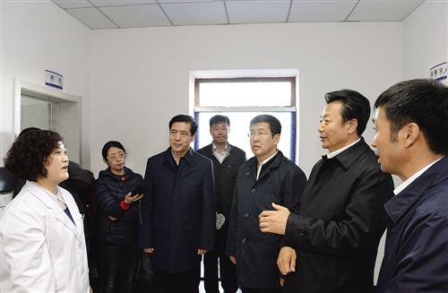10月9日,自治区党委书记王君、自治区主席巴特尔率领自治区巡回观摩检查组来到包头市九原区哈业胡同镇乌兰计一村标准化卫生院,了解卫生院建设和村民就诊情况。 记者 袁永红 摄