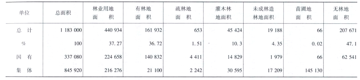 据2003年全区第五次森林资源连续调查,内蒙古自治区林业用地总面积4 409.34万公顷,其中,有林地1 619.32万公顷,占36.72%,疏林地66.53万公顷,占1.51%;灌木林地454.24万公顷,占10.30%;未成林造林地191.88万公顷,占4.35%,苗圃地0.66万公顷,占0.02%;无林地2 076.71万公顷,占47.10%。