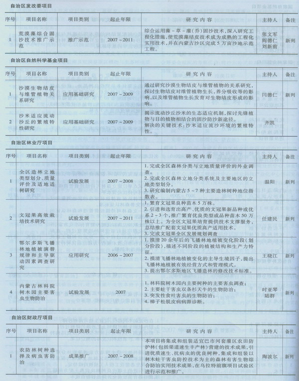 【科研成果】2007年,林业科学研究院承担的国家自然科学基金项目“干旱半干旱区沙地疏林配置结构与固沙机理的研究”等3个项目已按要求完成了结题工作;“中国森林生态网络体系建设大青山实验点研究”项目已完成鉴定准备工作;“引进北美樱桃园柏等高抗逆性优良种源与选育技术引进”项目已向自治区林业厅提交了延期鉴定申请,“内蒙古黄河中上游林业生态体系构建技术研究” 项目已完成鉴定的准备工作。“沙棘果采摘装置”已向自治区专利局申请专利。