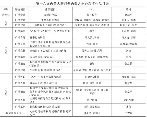 【第十六届内蒙古新闻奖表彰会】11月7日由自治区党委宣传部、自治区新闻工作者协会联合召开。内蒙古电台16件蒙汉语作品获内蒙古新闻奖,其中,特别奖1件,一等奖2件,二等奖7件,三等奖5件,优秀论文1件。