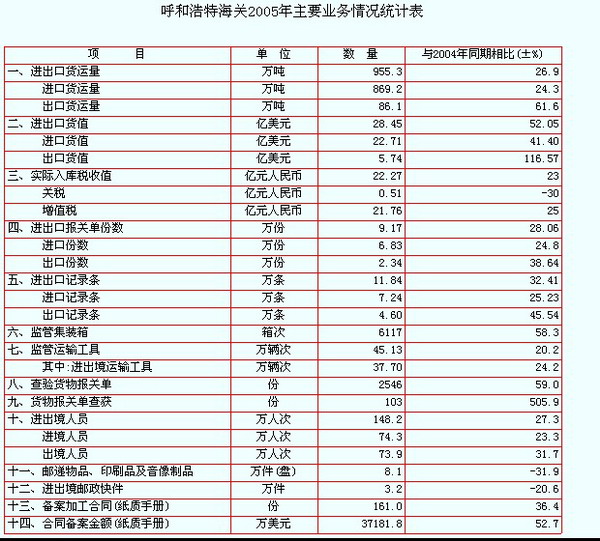 【概况】 呼和浩特海关为直属海关总署领导的正厅级海关。现下设副厅局级、正处级机构24个(含隶属海关和缉私分局),副处级机构2个(法规室、审单中心)。其中呼关内设机构有:办公室、通关管理和技术处、征税处、统计处、监管处、稽查处、缉私局(内设办公室、政治处、侦查处、查私处、法制处、情报处并辖有二连、包头两个分局)、人事教育处、财务处、思想政治工作办公室、监察审计室;派驻机构有:现场业务处、驻机场办事处;隶属海关有:二连海关(1956年1月1日开关)、包头海关(1997年7月18日开关)、鄂尔多斯海关(署人〔2003〕325号已批复设关);事业单位有:机关服务中心、电子口岸数据分中心。关区在册员工359人,其中呼关100人,二连海关136人,包头海关32人,缉私局60人,离退休13人。334名关员中,大专以上学历295人,占关员总数的92%,40岁以下职工有265人,为关员总数的83%;党员人数达到155人,占全体干部职工比例的48%;少数民族关员共103人,包括蒙古族、回族、满族、达斡尔族、鄂温克族、锡伯族等。呼和浩特海关业务辖区包括内蒙古自治区中西部的呼和浩特市、包头市、乌海市、鄂尔多斯市、巴彦淖尔市、乌兰察布市及锡林郭勒盟、阿拉善盟共8个盟(市),关区面积72万平方公里,边境线长2400多公里。关区辟有呼和浩特国际航空港、二连铁路、公路三个长期开放的口岸和珠恩嘎达布其、甘其毛道、策克、满都拉四个中蒙季节性开放的口岸。