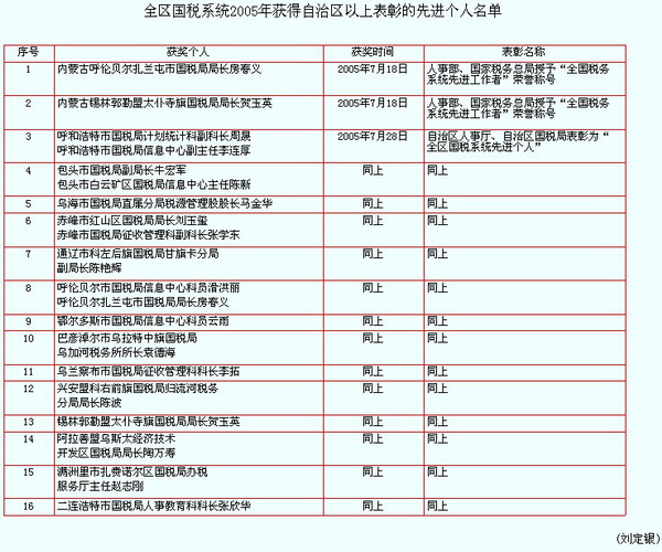 【干部队伍和党风廉政建设】 加强政治理论学习,认真开展保持共产党员先进性教育活动,提高干部职工的思想政治素质。加强领导班子建设,调整充实14个盟市国税局领导班子,并开展对盟市局领导班子进行巡视检查。完善干部管理制度,开展竞争上岗和干部交流工作,加强后备干部队伍建设,推行能级考评管理办法,提高了干部管理水平。加强干部培训工作,初步形成以需求为导向,分层次、分类别、多渠道、多形式的培训工作新格局。深入开展“肖占武经济犯罪案”警示教育,认真落实领导干部党风廉政建设责任制,积极开展预防职务犯罪工作,不断加强对税收执法权和行政管理权的监督制约,严肃查处“肖占武经济犯罪案”涉案违纪干部,推动全区国税系统的党风廉政建设。加大执法监察力度,开展行风评议,狠抓纠风工作。2005年全区国税系统,各级纪检监察部门执法监察立项372项,办结370项;提出执法监察建议207件,协助建章立制22项,加强政风行风建设。