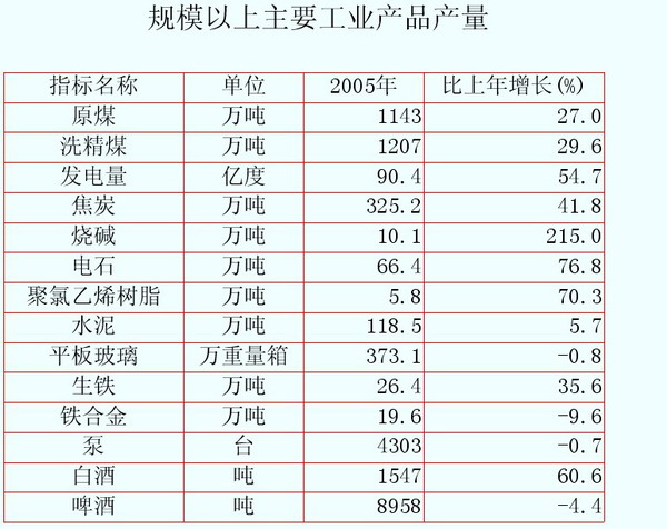 【工业】 2005年,全市完成工业增加值67.73亿元,比上年增长27.2%。工业对全市经济增长的贡献率53.9%。全市147户规模以上工业企业(即全部国有工业企业及年产品销售收入500万元及以上非国有企业)完成增加值59.0亿元,增长28.3%。其中,国有及国有控股企业实现增加值33.81亿元,增长41.9。产销衔接良好,产品销售率为94.96%。