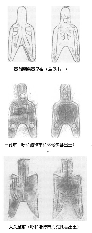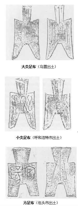 春秋时期的货币,迄今在内蒙古地区发现较少。50年代在呼和浩特旧城发现1枚“武”字空首垂肩弧足大布;在内蒙古东部通辽市、赤峰市夏家店上层文化遗址中所出土的仿制贝中,有相当于春秋时期的东胡族使用的货币。在内蒙古西部鄂尔多斯高原上所发现的商周时期的36枚天然贝和铜、骨、玉、石、牙等仿制贝中,也有春秋时期的贝币,90年代末,在呼和浩特市和林格尔县出土数枚圆首、圆肩、圆足3孔布。相比之下,战国时期的货币在内蒙古地区则多有出土,不仅数量多,而且品种也不少。