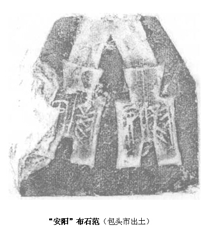1958年,包头市麻池窝尔吐壕战国遗址中出土3件“安阳”布币石范。其中面范1件,左侧有一缺口,“安”字欠完整,上方有倒“V”形浇铸口,分别通于布首,长宽均为9.5、厚1.5厘米,布模向下凹0.2厘米。范内并列刻有“安阳”方足布2枚。该钱模所刻“安”字为正书,若用此范铸币,则会出现反书的“安阳”布。背范2件,均残损较重,其一可见有两布背之阴刻纹,另一件仅存一布背纹,上部均有流口。3件布范外部均有便于缚扎的菱形方格纹。布范均用质地松软之石料制成,灰绿色,内含石棉。