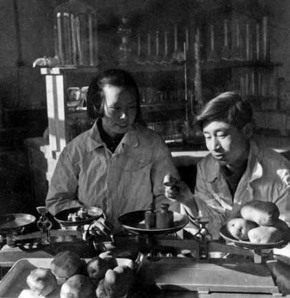 1962年乌兰察布盟农业科学研究所马铃薯研究小组人员正在测定马铃薯的淀粉成分。