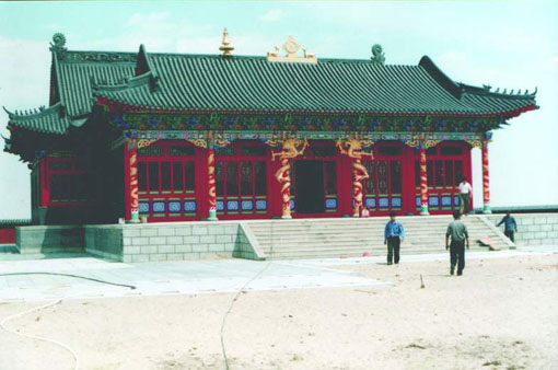 清高宗乾隆四十六年至四十九年(公元1781~1784年),先后建起了主庙(索克沁庙)15间,主庙前两边厢庙各10间(即索克沁东、西庙),山门3间(即金刚庙),另外还有喇嘛住的伽蓝3间,共41间,同时建起了5~6尺高的砖石墙。后经嘉庆、道光、咸丰、同治以及中华民国期间的补建、扩建,甘珠尔庙逐步形成11座庙宇、4座庙仓、100多间伽蓝,总建筑面积10 000平方米的规模,建筑风格集汉、蒙古、藏3种风格为一体,反映了3种文化的巧妙融合。在碧绿的大草原上出现如此碧瓦红墙的一座古代宫殿式建筑物,远处望去,恰似海市蜃楼。