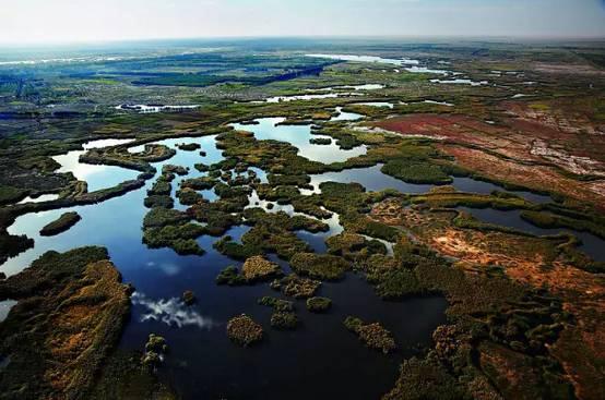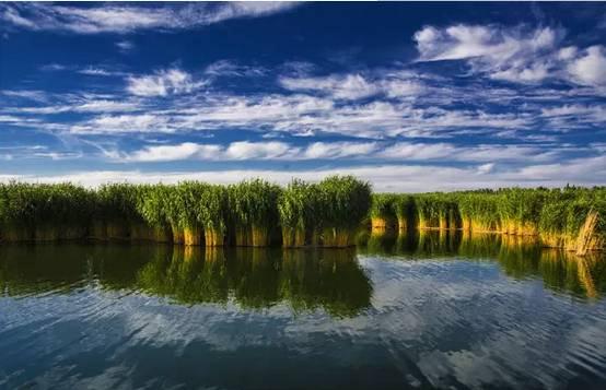 湖泊呈不规则半月形,湖中有大小岛屿10余处,芦苇茂盛,自然景观诱人。湖的北岸紧贴沙漠,沙生植物造型独特。湖的四周台地上是良田万顷,属于国家无公害生产基地。