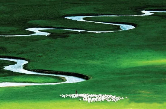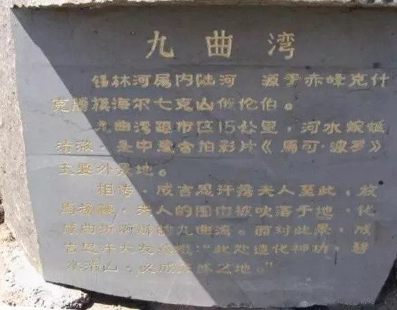 锡林河九曲湾随地势起伏,婀娜多姿;河道弯弯曲曲,宛若一条银色的飘带镶嵌在绿色的地毯上,并与蓝天、白云、牛羊有机组合,构成了一幅仙境般的天然画卷。中国与意大利合拍的历史巨片《马可·波罗》曾在这里拍摄了大量外景镜头。1998年,以此景为蓝本发行了锡林郭勒特种邮票。(摘自《内蒙古自治区志·旅游志》)