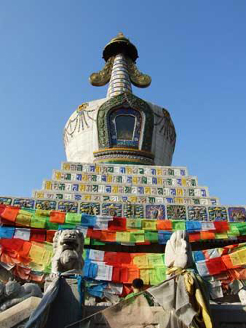 汉白玉石塔位于大殿东侧,鼓楼、广场东面。是内蒙古地区康熙皇帝御制的“平定噶尔丹纪功”碑,是覆钵式喇嘛塔中最完整的一座。塔身是用白石雕刻垒砌而成,高约15米,石塔基座用石条砌成方坛。方坛上面为方形束腰座;束腰部分雕刻火焰、金刚杵、狮等图案花纹;四角立圆柱,上呈阶梯状座身,分五级逐步内收;最下一级刻图案花纹,以上各级分别刻写梵文六字真言。覆钵为宽肩型,周围饰以缨络,南面正中砌出火焰形佛龛。覆钵上面的塔刹,用石刻出十三相轮,再覆以铜制星月和宝盖。白色石料的塔身上,纹饰五彩缤纷,色调对比鲜明,是中国北方建筑艺术的宝贵实物和清代覆钵式塔的代表作。