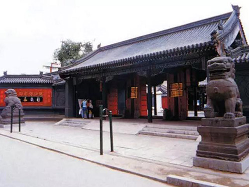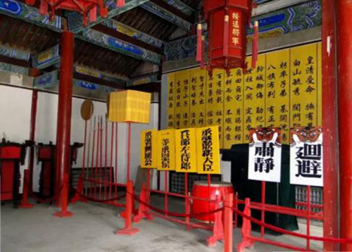 府门前有巨型石狮一对,左雄右雌,雄狮滚绣球,雌狮弄幼崽,森严中不失谐趣。石狮左右分别为钟亭、鼓亭。钟鼓亭向南建有守卫处,鼓手房。由此到照壁间由扇形鹿角架围墙和牌坊门(又称辕门)连接。从衙署府门到大照壁之间形成一个呈四方形的小广场,是衙署的外院,主要用于保护衙署。