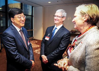 图一:伊利集团董事长潘刚(左一)和苹果公司首席执行官库克、杜邦公司董事长柯艾伦热烈交谈