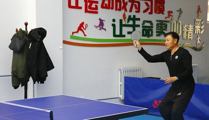 居民在活动室打乒乓球