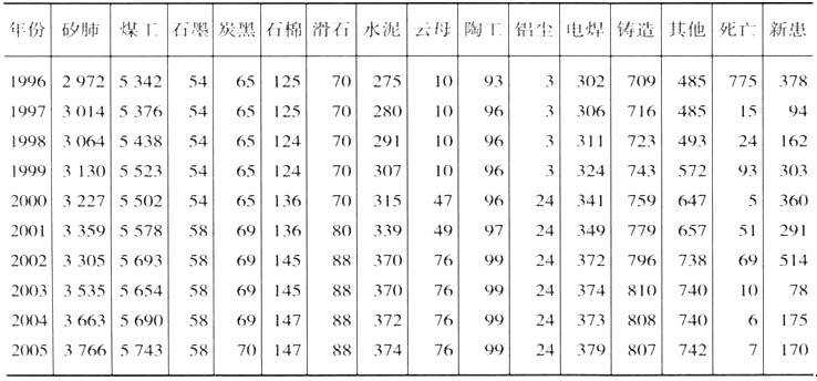 至2005年底,已对全区存在职业病危害因素的2 833个职业建立了卫生档案,对接触职业病危害因素的289 997名劳动者建立了职业健康监护卡。全区共诊断尘肺17 149例,其中现患病例12 401例,死亡4 748例;共诊断急慢性中毒1 308例,其他职业病1 008例。